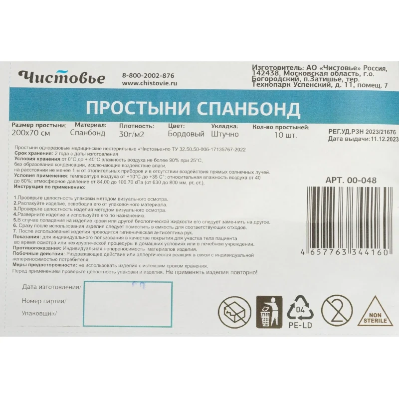 Гигиеническая простыня, изготовленная из гипоаллергенного материала спанбонд с плотностью 30 г/кв.м, предназначена для использования в салонах красоты, медицинских учреждениях, СПА-центрах, массажных салонах, кабинетах стоматологии, а также в банях и саунах. Простыня не имеет перфорации и не обладает впитывающими свойствами. Срок годности составляет 36 месяцев.
