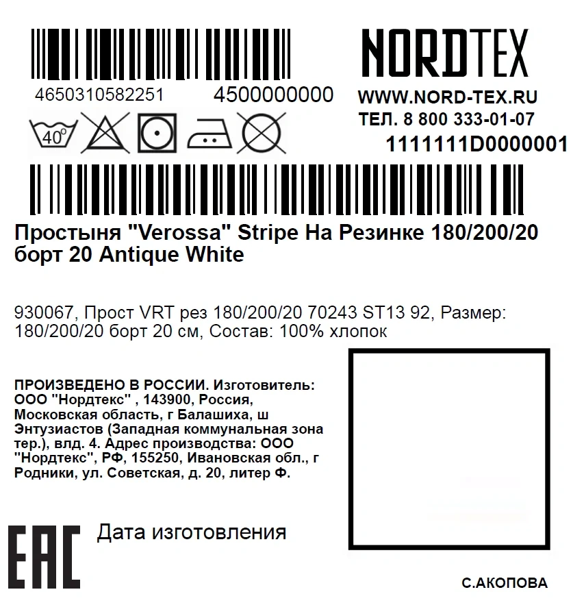 | Размер простыни, см | 180 х 200 |