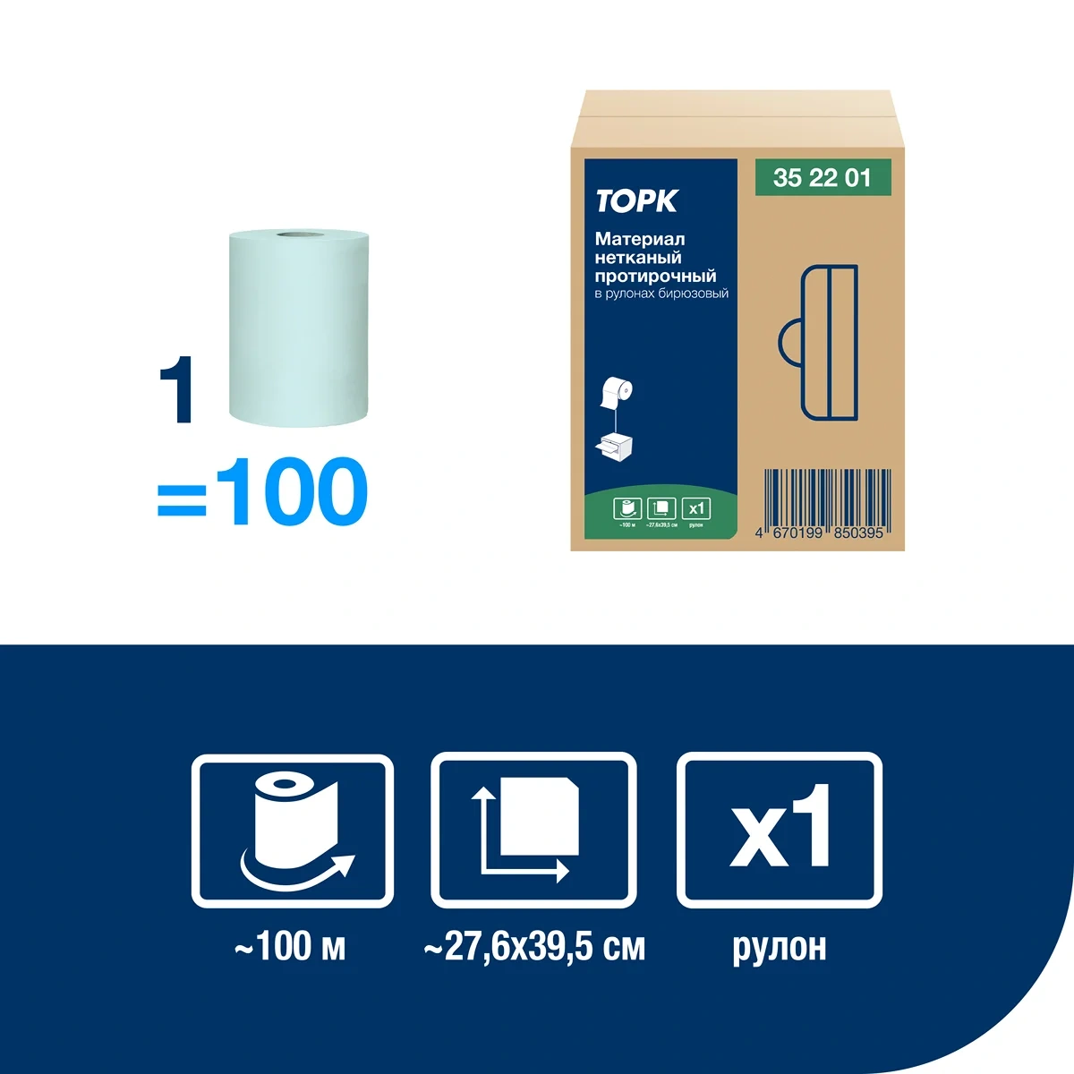 Универсальный нетканый материал Tork - мягкий, эластичный и при этом прочный. Идеальное решение для протирки почти любых загрязненных поверхностей. Быстро впитывает масло и жидкость, упрощая работу. Разрешен для использования на пищевом производстве. Уникальный картонный короб-диспенсер защищает материал от пыли и грязи, а также позволяет отбирать материал по одному листу, что снижает расход и количество отходов. Превосходно впитывает масло и воду, легко снимает жир и глубоко въевшуюся грязь.Подходит для использования с большинством химических растворителей: удерживает и выводит растворители более эффективно, чем продукция из текстиля, что уменьшает расход.Может использоваться повторно, долговечный протирочный материал - прекрасно подойдет в качестве полотенца для уборки и замены ветоши.Размеры рулона: ширина 28.8 см, диаметр 19.5 см.Размер листа: длина 39.5 см, ширина 27.6 см.Возможно использование в диспенсерах с держателем рулона диаметром не более 58 мм.