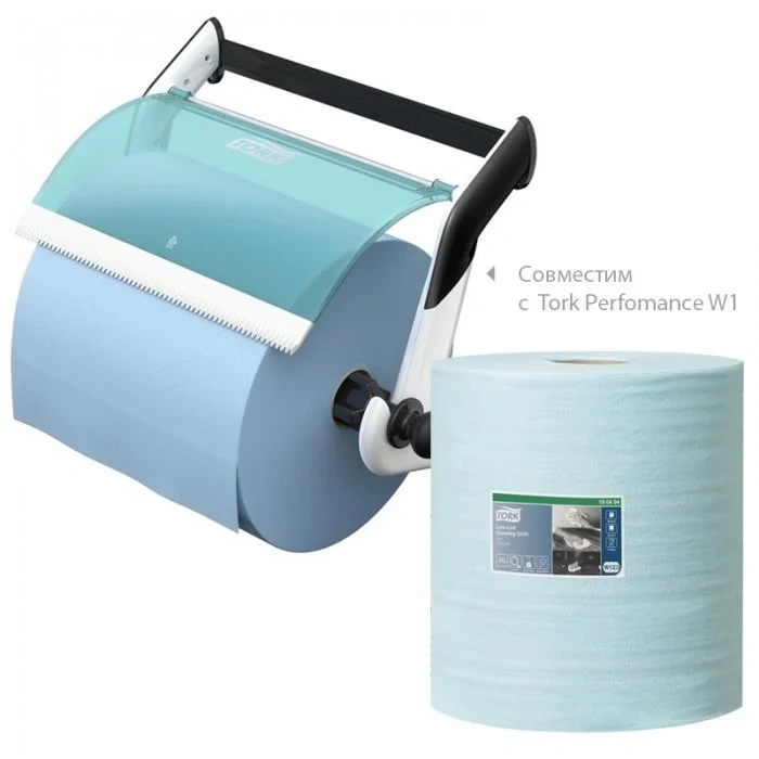 Материал совместим с настенными и напольными диспенсерами Tork систем W1,W2 и W3, которые обеспечивают защиту материала от влаги и грязи и полистовую подачу для уменьшения расхода и объема отходов.