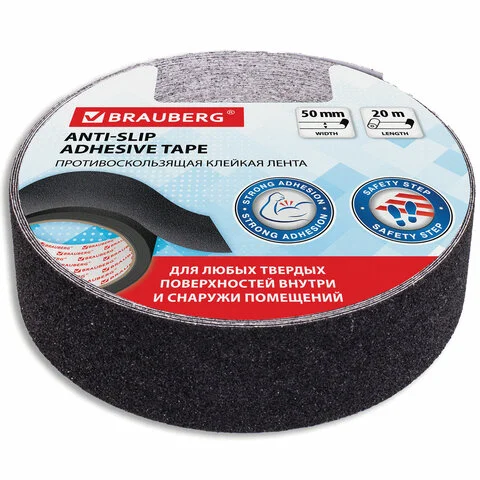 Клейкая ПРОТИВОСКОЛЬЗЯЩАЯ зернистая лента 50 мм х 20 м, ЧЕРНАЯ, основа ПВХ, BRAUBERG, 606774