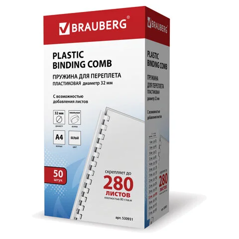 Пружины для переплета пластиковые Brauberg белые, на 241-280 листов, 32мм, 50шт, овал