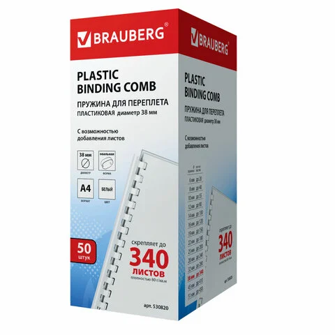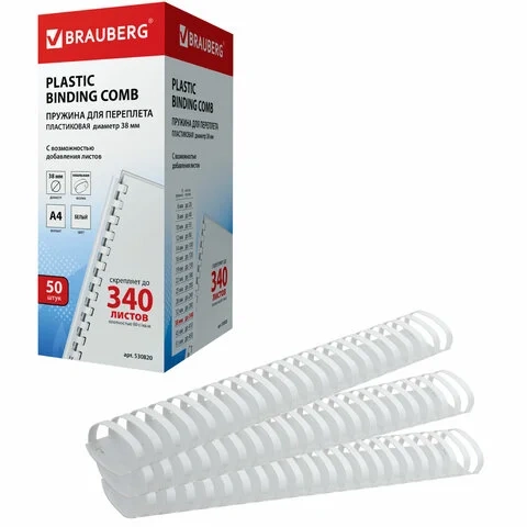 Пружины для переплета пластиковые Brauberg белые, на 281-340 листов, 38мм, 50шт, овал