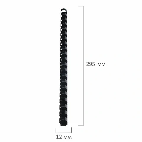 Рекомендуется использовать для переплета документов объемом от 56 до 80 листов. Изготовлена из высококачественного пластика чёрного цвета. Состоит из 21 кольца диаметром 12 мм. В упаковке 100 штук.