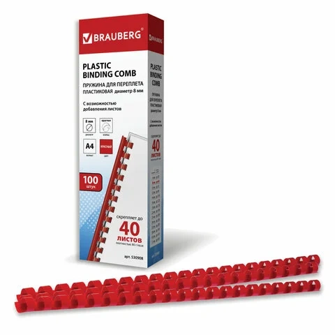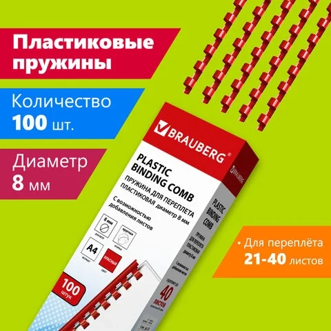Пружины для переплета пластиковые Brauberg красные, на 21-40 листов, 8мм, 100шт, кольцо