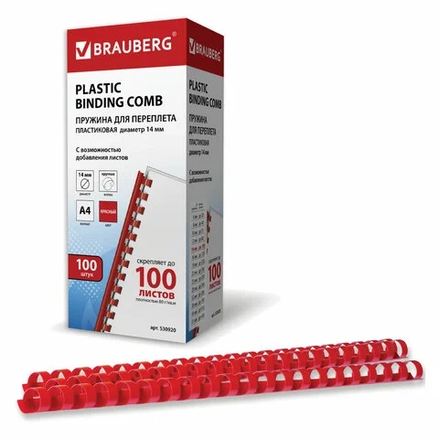 Пружины для переплета пластиковые Brauberg красные, на 81-100 листов, 14мм, 100шт, кольцо