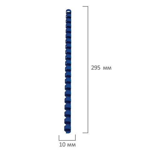 Рекомендуется использовать для переплета документов объемом от 41 до 55 листов. Изготовлена из высококачественного пластика синего цвета. Состоит из 21 кольца диаметром 10 мм. В упаковке 100 штук.