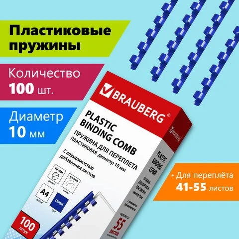 Пружины для переплета пластиковые Brauberg синие, на 41-55 листов, 10мм, 100шт, кольцо