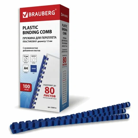 Пружины для переплета пластиковые Brauberg синие, на 56-80 листов, 12мм, 100шт, кольцо