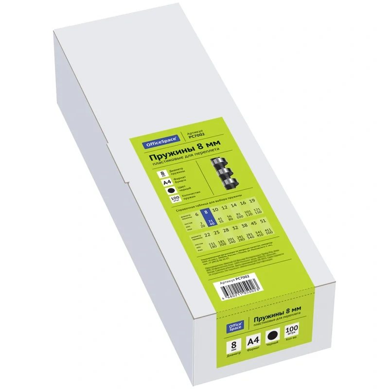 Пластиковые пружины OfficeSpace черного цвета диаметром 8мм предназначены для переплета документов. Легко выдерживают многократное раскрытие при необходимости добавить или удалить листы из готовой брошюры. Рекомендуемый объем брошюры при использовании данного диаметра пружины: 21-40 листов.