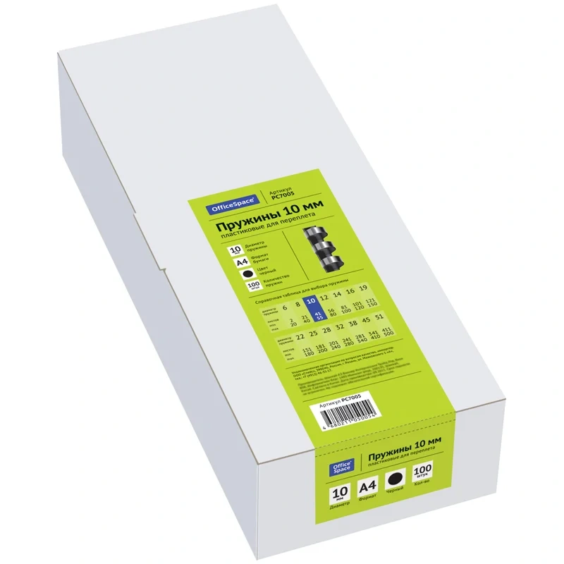 Пластиковые пружины OfficeSpace черного цвета диаметром 10мм предназначены для переплета документов. Легко выдерживают многократное раскрытие при необходимости добавить или удалить листы из готовой брошюры. Рекомендуемый объем брошюры при использовании данного диаметра пружины: 41-55 листов.