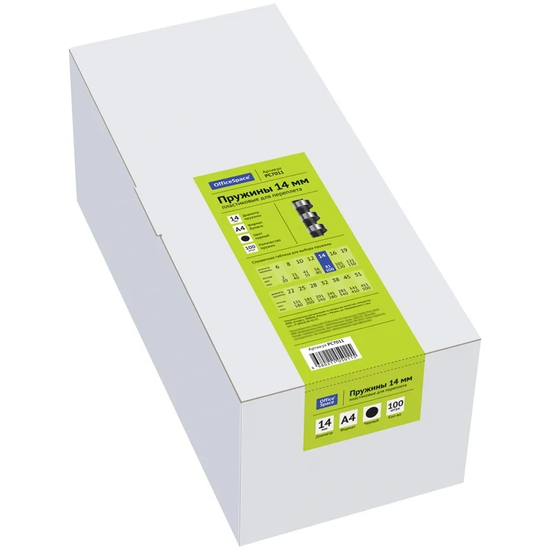 Пластиковые пружины OfficeSpace черного цвета диаметром 14мм предназначены для переплета документов. Легко выдерживают многократное раскрытие при необходимости добавить или удалить листы из готовой брошюры. Рекомендуемый объем брошюры при использовании данного диаметра пружины: 81-100 листов.