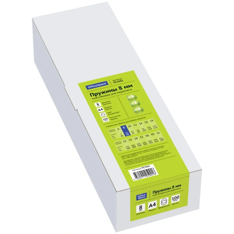 Пластиковые пружины OfficeSpace прозрачного цвета диаметром 8мм предназначены для переплета документов. Легко выдерживают многократное раскрытие при необходимости добавить или удалить листы из готовой брошюры. Рекомендуемый объем брошюры при использовании данного диаметра пружины: 21-40 листов.
