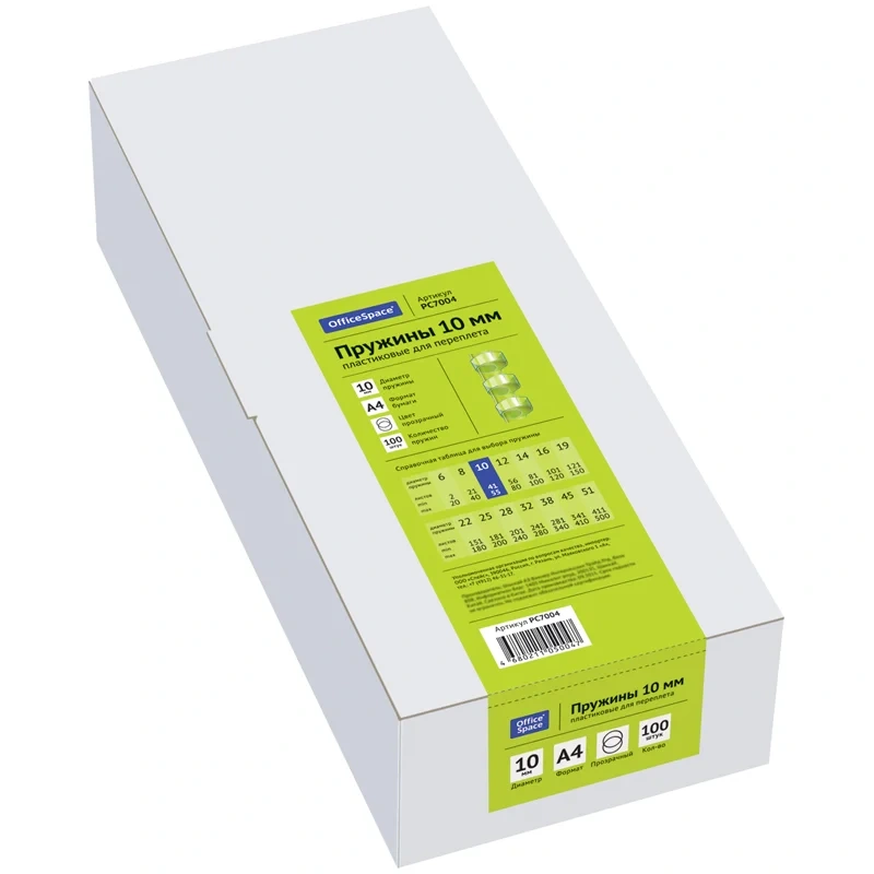 Пластиковые пружины OfficeSpace прозрачного цвета диаметром 10мм предназначены для переплета документов. Легко выдерживают многократное раскрытие при необходимости добавить или удалить листы из готовой брошюры. Рекомендуемый объем брошюры при использовании данного диаметра пружины: 41-55 листов.
