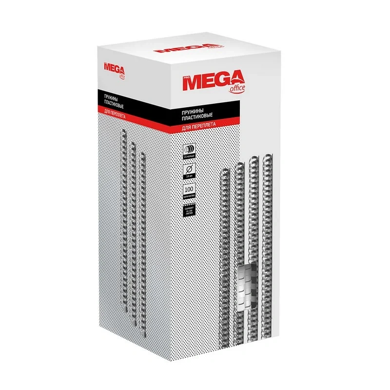 Пружины для переплета пластиковые ProMega office предназначены для сшивания до 100 листов формата А4 при помощи брошюровщика. Позволяют вынимать и добавлять листы в готовый документ. Изготовлены из прочного пластика белого цвета, состоят из 21 кольца диаметром 14 мм, шаг переплета — 3:1. Поставляются по 100 штук в упаковке.