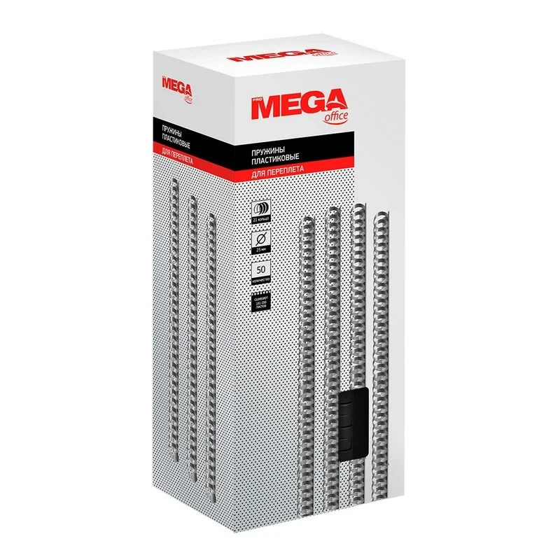 Пружины для переплета пластиковые ProMega office предназначены для сшивания до 200 листов формата А4 при помощи брошюровщика. Позволяют вынимать и добавлять листы в готовый документ. Изготовлены из прочного пластика черного цвета, состоят из 21 кольца диаметром 25 мм, шаг переплета — 3:1. Поставляются по 50 штук в упаковке.
