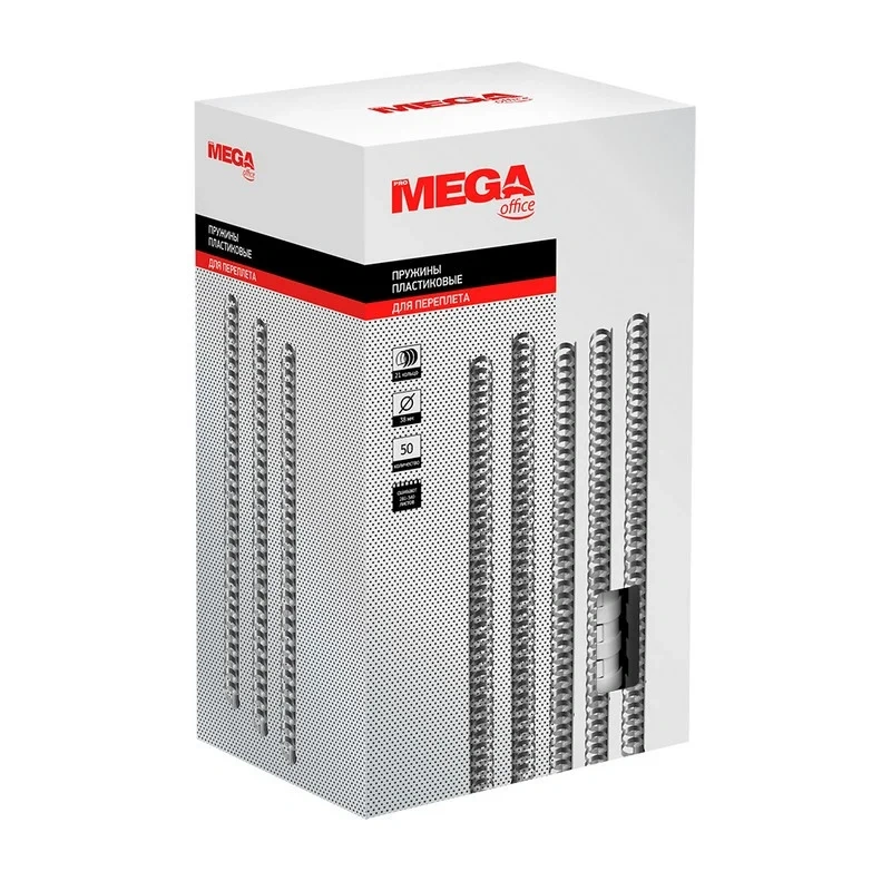 Пружины для переплета пластиковые ProMega office предназначены для сшивания до 340 листов формата А4 при помощи брошюровщика. Позволяют вынимать и добавлять листы в готовый документ. Изготовлены из прочного пластика белого цвета, состоят из 21 кольца диаметром 38 мм. Поставляются по 50 штук в упаковке. Овальной формы.