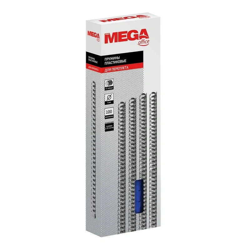 Пружины для переплета пластиковые ProMega office предназначены для сшивания до 20 листов формата А4 при помощи брошюровщика. Позволяют вынимать и добавлять листы в готовый документ. Изготовлены из прочного пластика синего цвета, состоят из 21 кольца диаметром 6 мм, шаг переплета — 3:1. Поставляются по 100 штук в упаковке.