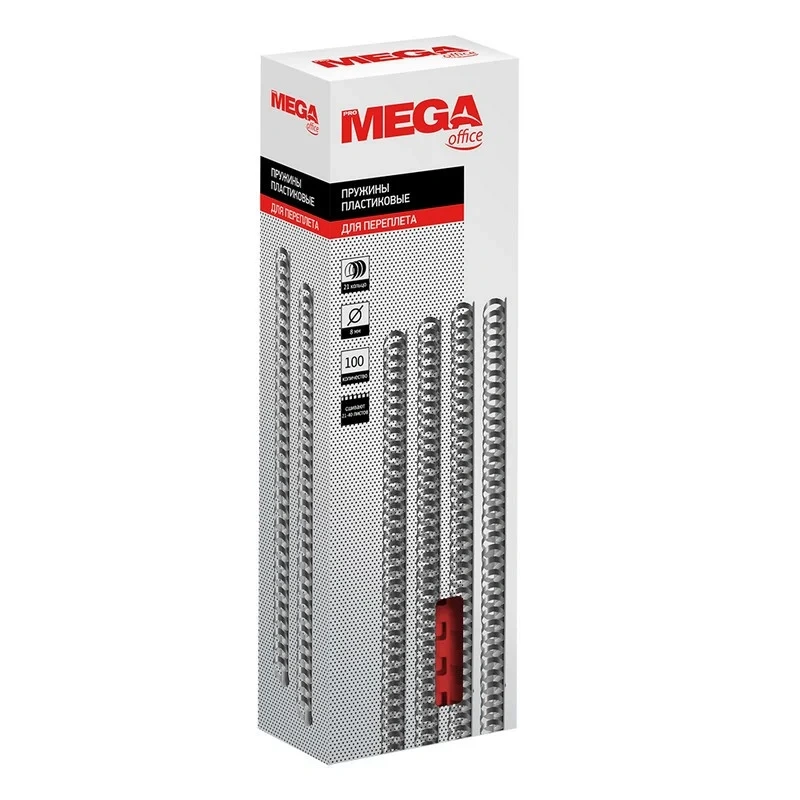 Пружины для переплета пластиковые ProMega office предназначены для сшивания до 40 листов формата А4 при помощи брошюровщика. Позволяют вынимать и добавлять листы в готовый документ. Изготовлены из прочного пластика красного цвета, состоят из 21 кольца диаметром 8 мм, шаг переплета — 3:1. Поставляются по 100 штук в упаковке.