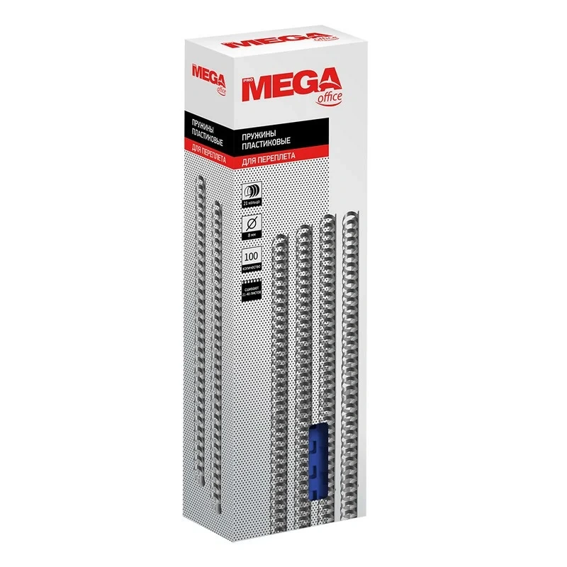 Пружины для переплета пластиковые ProMega office предназначены для сшивания до 40 листов формата А4 при помощи брошюровщика. Позволяют вынимать и добавлять листы в готовый документ. Изготовлены из прочного пластика синего цвета, состоят из 21 кольца диаметром 8 мм, шаг переплета — 3:1. Поставляются по 100 штук в упаковке.