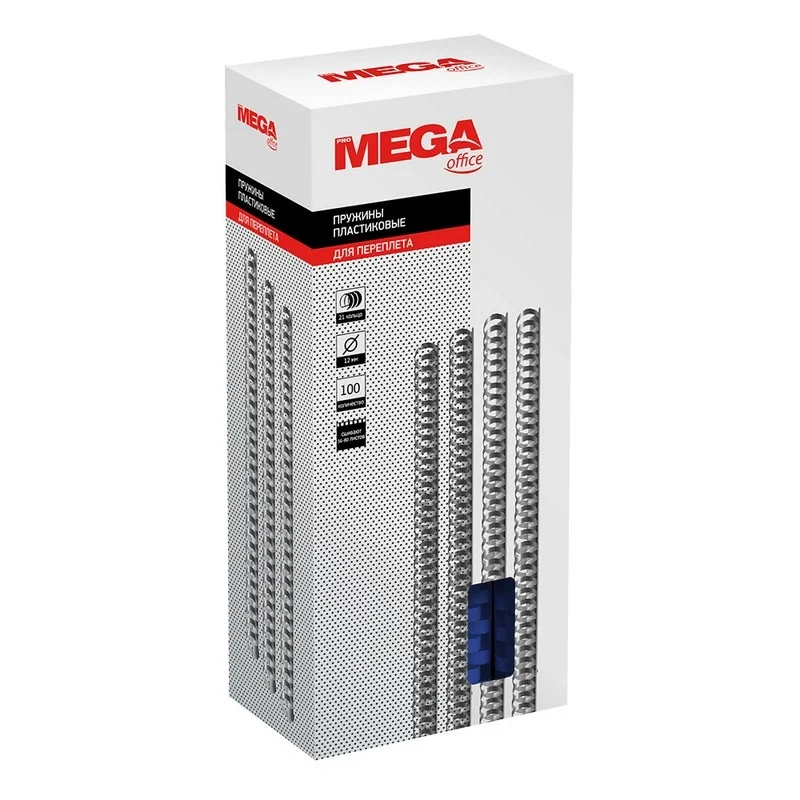 Пружины для переплета пластиковые ProMega office предназначены для сшивания до 80 листов формата А4 при помощи брошюровщика. Позволяют вынимать и добавлять листы в готовый документ. Изготовлены из прочного пластика синего цвета, состоят из 21 кольца диаметром 12 мм, шаг переплета — 3:1. Поставляются по 100 штук в упаковке.