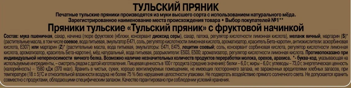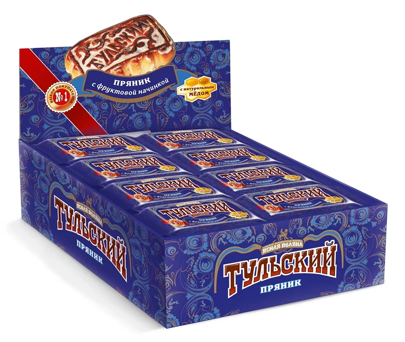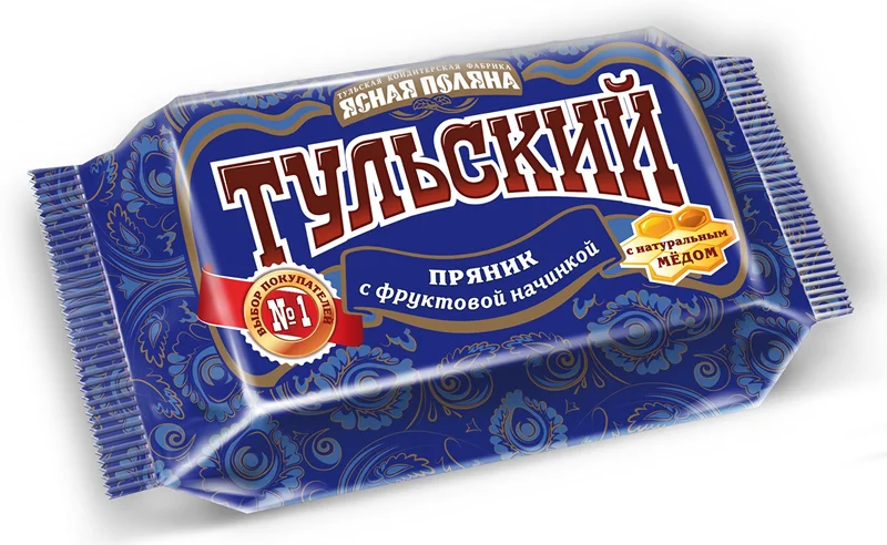 Тульский пряник с начинкой из фруктового повидла, покрытый тонкой белесой гладью сахарной глазури. Пряную сладость ароматного печатного коржа дополняет легкая фруктовая кислинка густой начинки. Настоящий тульский пряник, гордость региона и визитная карточка фабрики Ясная Поляна. Вкус, достойный царской трапезы.
