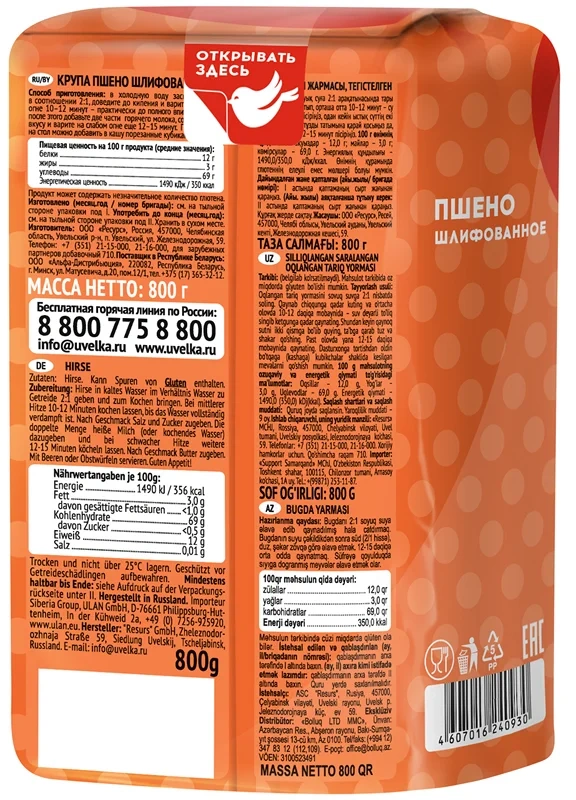 Пшено Увелка шлифованное, 800г