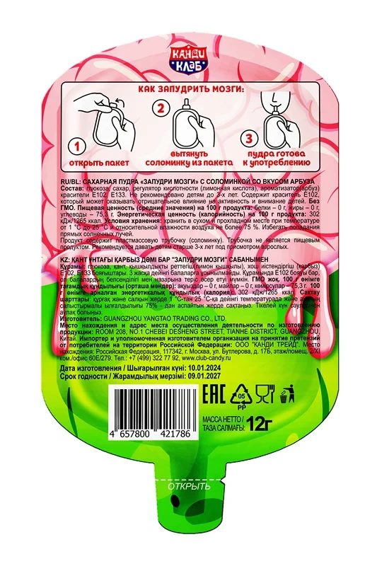 Пудра сахарная Канди клаб Запудри мозги, 12г x 36 шт - это не просто сладость, а целый микс разных вкусов. Каждая капсула пудры - это отдельная радость и удовольствие для вашего ребенка, выполненная в шуточной форме. Они станут отличным перекусом для малыша, когда он готовится к школе, в садике или просто играет дома. Сахарная пудра необычный и вкусный способ пополнить его повседневный рацион. Пудра сладкая незаменима в качестве угощения на любом празднике - дома, в школе, в детском саду или развлекательном центре.