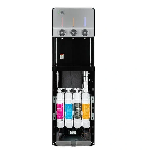 Пурифайер имеет индикацию отключения нагрева и охлаждения. Корпус выполнен в черном цвете с серебристыми вставками на передней панели.
