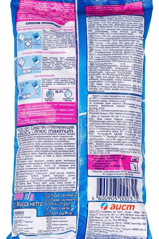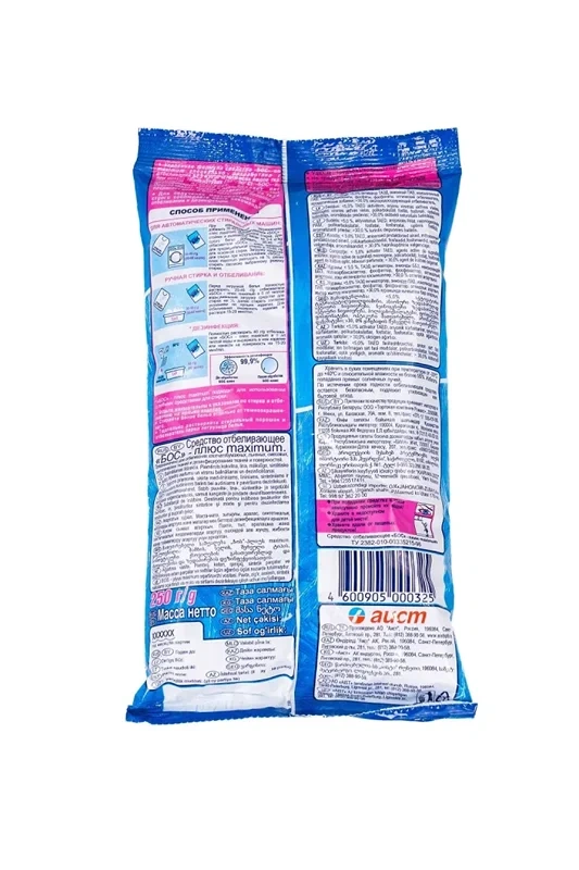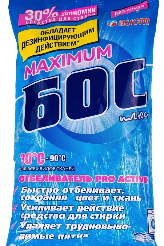 Кислородосодержащий отбеливатель для всех видов тканей БОС-Плюс.Рекомендуется для применения с моющими средствами при замачивании, кипячении и машинной стирке. Формула средства разработана для отбеливания без кипячения всех видов тканей, включая шерсть и шёлк, при низких температурах. Рекомендуется для занавесок из синтетики.Является активатором стирки, идеально подходит для цветного белья, совместим с любыми моющими средствами. Дезинфицирует бельё и различные поверхности.Состав: менее 5% активатор ТАЭД, а-ПАВ, нПАВ, поликарбоксилаты, фосфаты, фосфонаты, более 30% кислородосодержащий отбеливатель. Дополнительно: оптический отбеливатель, ароматические добавки.ТУ 2382-010-00335215-96Срок годности: 24 мес.