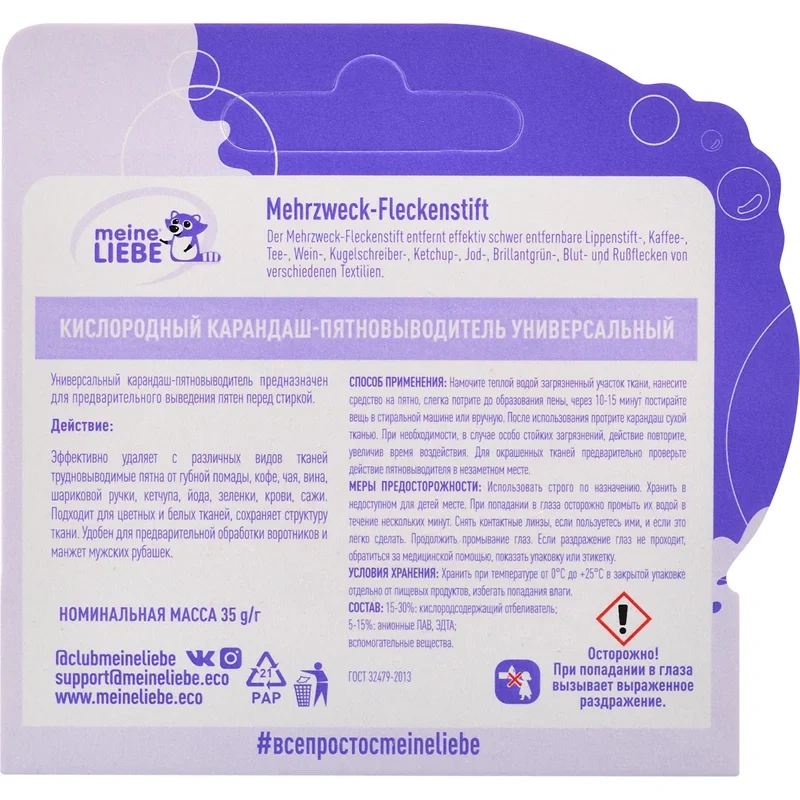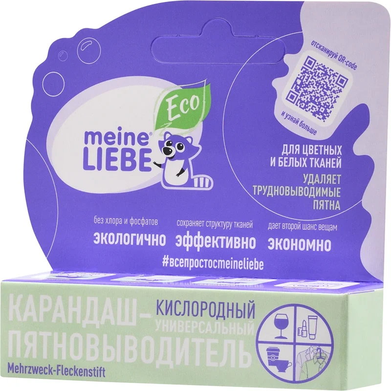 Экологичный, универсальный карандаш-пятновыводитель Майне Либе – это эффективное, многофункциональное средство для удаления всех видов пятен и предварительной обработки цветных и белых тканей. Кислородный отбеливатель в формате стика без следа удаляет загрязнения (в том числе застарелые), разрушая структуру пятна, а молекулы ПАВ удаляют частицы загрязнения с вещи в процессе стирки. Благодаря поверхностному способу удаления, процесс безвреден для окрашенных и деликатных изделий, бережен к тканям. Эффективное очищение. Эффективная концентрация ПАВ и активный кислород в составе карандаша справляется с такими видами пятен, как от губной помады и тонального крема, кофе, чая, вина, соков, ягод и овощей, шариковой ручки, фломастера йода, зеленки, крови, кетчупа, сажи и жира. Экологический очиститель подойдет для предварительной обработки воротников и манжет рубашек, детской и взрослой одежды, ковров, обивки автомобиля и других текстильных тканей. Средство компактно и универсально, подойдет для поездок в отпуск и неожиданных загрязнениях вне дома, когда срочно нужно убрать/минимизировать пятно. Кислородный отбеливатель-пятновыводитель прост в использовании: Нанести средство на пятно, предварительно смоченное водой, потрите ткань. Подождите 15 минут и постирайте вещь подходящим к данному типу ткани стиральным порошком Meine Liebe. При необходимости, в случае особо стойких загрязнений, действие повторить. В случае выведения пятен на цветной ткани рекомендуется предварительно опробовать действие средства на небольшом незаметном участке текстиля. Безопасная формула для дома и человека Бытовая химия Meine Liebe производится по уникальной формуле под контролем качества компании Grunlab (Германия), что гарантирует их надежность, эффективность и безопасность. Состав и упаковка средств биоразлагаемые, не содержат хлора, фосфатов, фосфонатов не загрязняют окружающую среду.