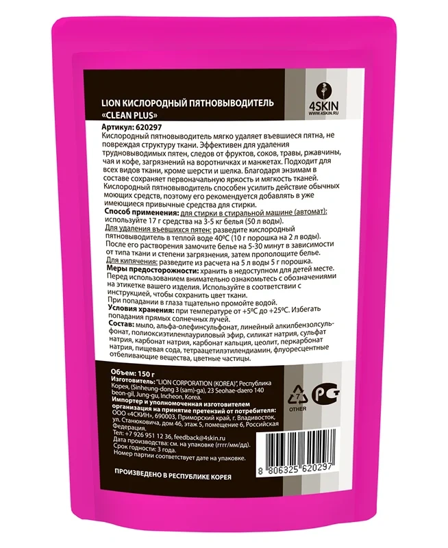 Пятновыводитель кислородный Lion Clean Plus, 150г