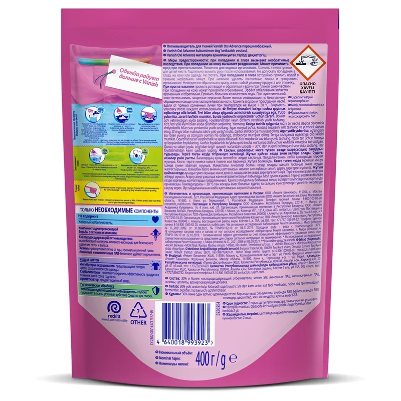 Vanish Oxi Advance Мультисила порошкообразный пятновыводитель - новое мультифункциональное средство без хлора для усиления качества стирки цветных тканей. Теперь Ваниш не только эффективно удаляет пятна, но и предотвращает окрашивание ткани, избавляет от неприятного запаха и производит гигиеническую обработку! Ваниш Мультисила – одно решение трех проблем! Продли жизнь любимым вещам с Vanish!