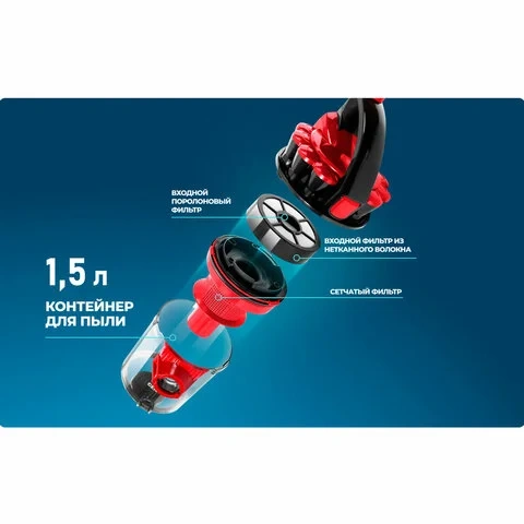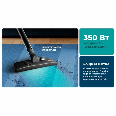 Легкий и маневренный пылесос с технологией 'Мультициклон' – практичное решение для уборки в помещении. Его мощности всасывания (350 Вт) хватает для глубокой и эффективной чистки ковров и твердых напольных покрытий.