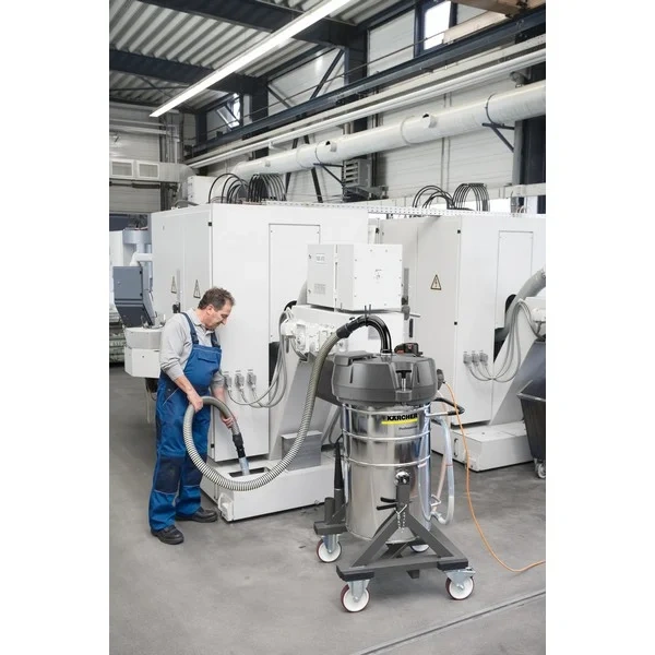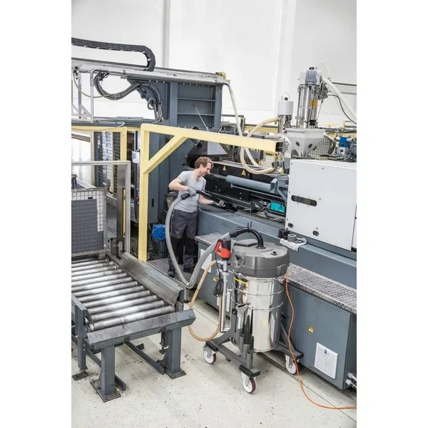 Аппарат IVR-L 100/24-2 Tc Me Dp, оснащенный 100-литровым мусоросборником и автономным бочечным насосом, прекрасно подходит для сбора жидкостей с твердыми веществами, отделения смазочно-охлаждающей жидкости от стружки и ее возврата в технологический процесс.