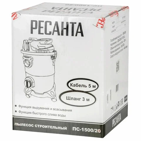 Пылесос РЕСАНТА ПС-1500/20 имеет вместительные контейнеры объемом 20 л, что позволяет собирать большое количество мусора. В комплекте идут насадки для различных типов уборки. Предусмотрена функция влажной уборки для удаления жидкости.