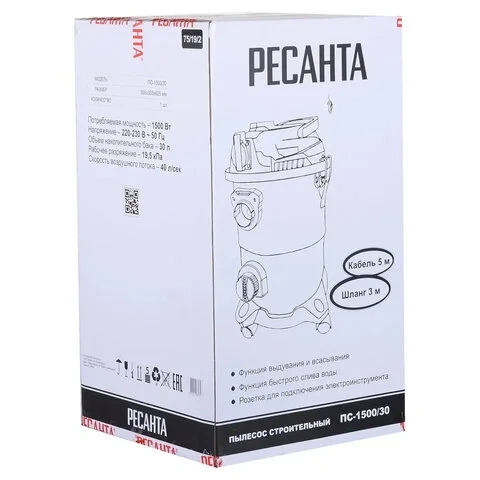 Пылесос РЕСАНТА ПС-1500/30 имеет вместительный контейнер объемом 30 л, что позволяет собирать большое количество мусора. В комплекте идут насадки для различных типов уборки. Предусмотрена функция влажной уборки для удаления жидкости.