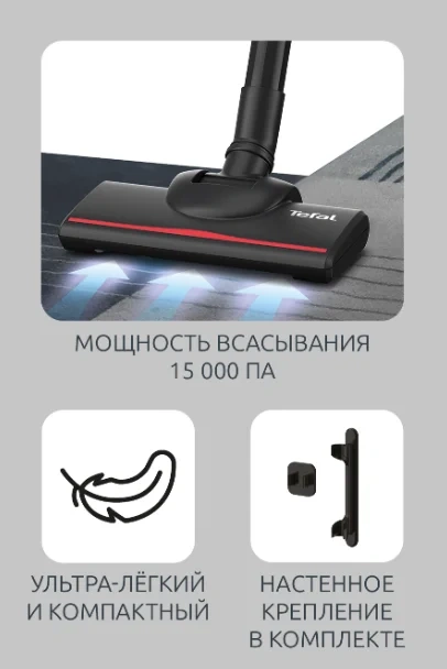 Проводной пылесос Tefal Vertical Vacuum Cleaner создан для скорости и маневренности: он мгновенно справляется с загрязнениями благодаря мощности 650Вт и мощности всасывания 15 кПа, а также компактному циклонному фильтру на 0,4л. Легкая конструкция (1,5кг) и полная комплектация (насадка для пола, щелевая насадка, настенное крепление) превращают любую уборку в быстрое и эффективное занятие.