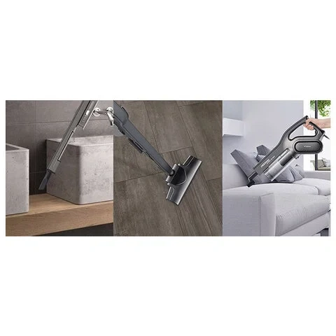 Ручка эргономичной формы позволяет с комфортом удерживать вертикальный пылесос под любым углом. В комплекте с пылесосом поставляются: универсальная насадка для уборки гладких напольных покрытий и ковров, щетка для мебели и авто и щелевая насадка.