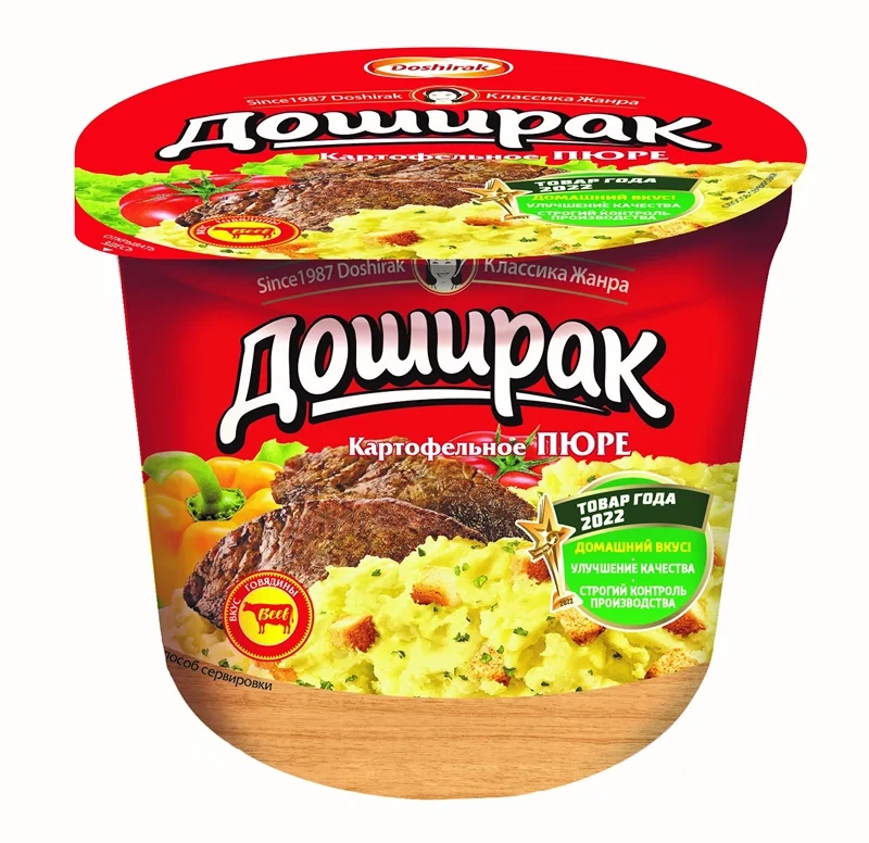 Картофельное пюре быстрого приготовления производится из самых высококачественных ингредиентов. ляющие нашего пюре такие же, как на любой домашней кухне: золотистый жареный лучок, хрустящие сухарики. Приготовление занимает 5 минут, а качество нашего продукта гарантировано компанией Доширак!