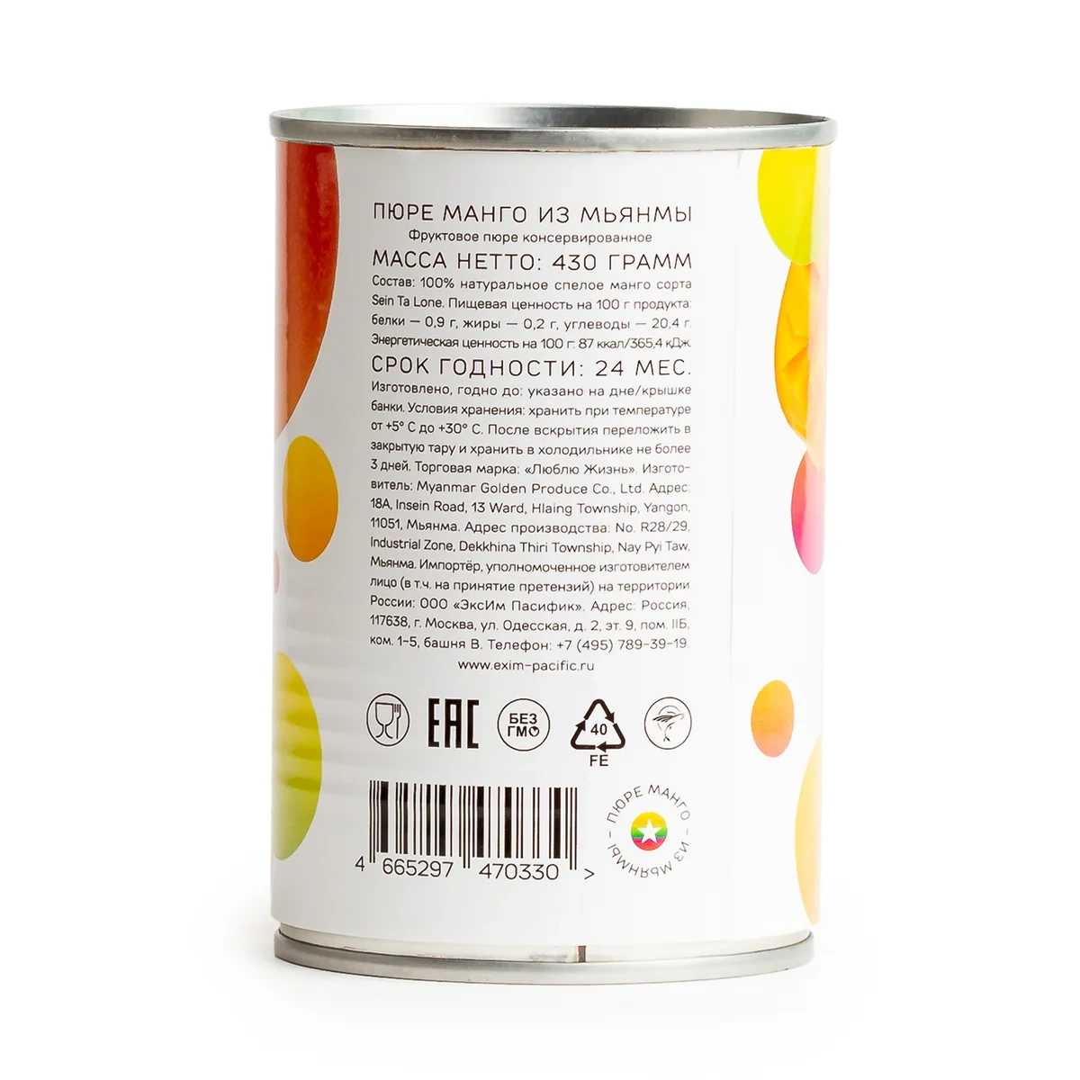 Пюре Люблю жизнь манго из Мьянмы без добавления сахара, 430г