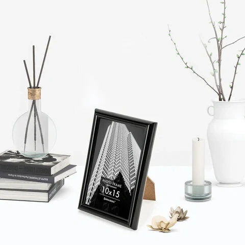 Рамка компактного формата А6 (10х15 см) выполнена из ПВХ в черном цвете, за счет чего отлично впишется как в домашний, так и в деловой интерьер. Имеется возможность вертикального и горизонтального подвеса, а также имеется подставка для установки рамки на столе.