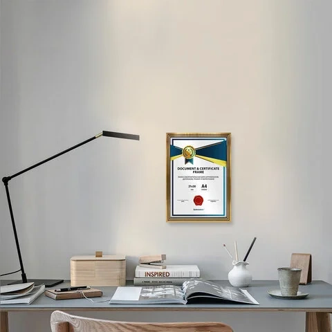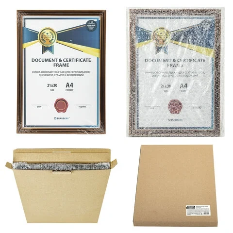 Рамка стандартного формата А4 (21х30 см) выполнена из ПВХ в бронзовом цвете, за счет чего отлично впишется как в домашний, так и в деловой интерьер. Имеется возможность вертикального и горизонтального подвеса, а также имеется подставка для установки рамки на столе.