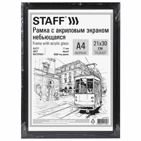 Рамка 21х30 см небьющаяся, багет 17 мм МДФ под дерево, STAFF 'Carven', черная, 391319