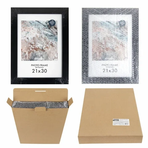 Рамки формата А4 (21х30 см) выполнены из МДФ черного цвета. У каждой рамки имеется возможность вертикального и горизонтального подвеса, а также имеется подставка для установки рамки на столе.