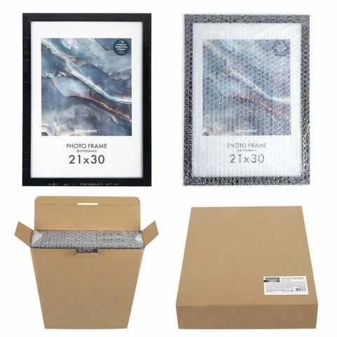 Рамки формата А4 (21х30 см) выполнены из МДФ черного цвета. У каждой рамки имеется возможность вертикального и горизонтального подвеса, а также имеется подставка для установки рамки на столе.