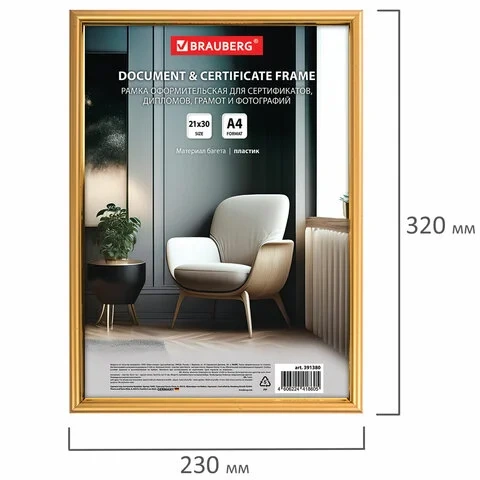 Рамка 21х30 см со стеклом, багет 14 мм пластик, BRAUBERG 'HIT2', матовое золото, 391380