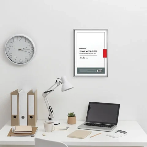 Рамка стандартного формата А4 (21х30 см) выполнена алюминия в серебристом цвете, за счет чего отлично впишется как в интерьер любого делового помещения, а также и в домашний интерьер, например, в стиле 'лофт'. Имеется возможность вертикального и горизонтального подвеса с помощью зажимов на рамке, а также имеется подставка для установки рамки на столе.