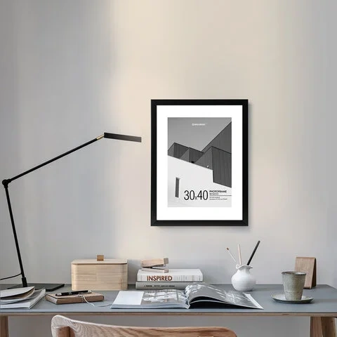Интересной особенностью рамки является паспарту – вставка из плотного белого картона, которая создает нейтральную зону между рамкой и изображением, и за счет этого дополнительно акцентирует на нем внимание. Ширина паспарту слева/справа – 5 см, верхняя и нижняя части – 5,5 см. Минималистичный черный багет без лишних деталей шириной 20 мм делает рамку абсолютно универсальной для любого интерьера. Высота багета – 15 мм. Вставка из акрила вместо обычного стекла делает рамку менее хрупкой. Перед применением снимите пленку с обеих сторон экрана.