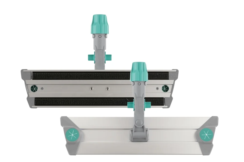 Плоская система подметания с рамой со стретч-лентой и системой клипс, которая может использоваться либо предварительно замоченной, либо замачиваемой по требованию с помощью станции для замачивания или с рукоятками с резервуаром